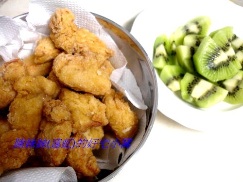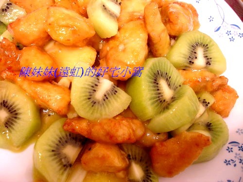 最後再將炸好的雞肉塊及奇異果加入拌炒均勻即可